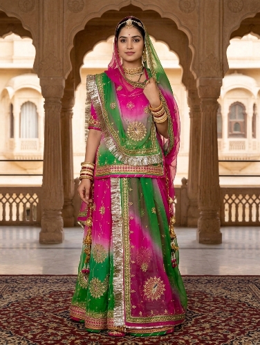 Half-Pure Poshak Rai bandhej with aari magji gota kiran astar Bandhej green